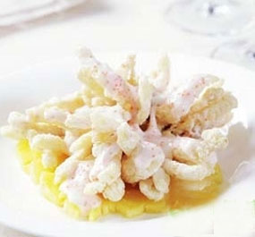 4、开小火,锅内放黄油,先放入蒜末、葱花,胡萝卜丁,再加入咖喱煸出香味,然后放入椰浆、放入北极虾、红椒丁锅中炒香,加入少许水,放入白糖、盐调好味,最后放入青豆和菠萝肉丁翻炒均匀。