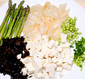 6、将焯好的芦笋码放在盘底,把出锅的海参豆腐倒上撒红椒丝即可。 |
