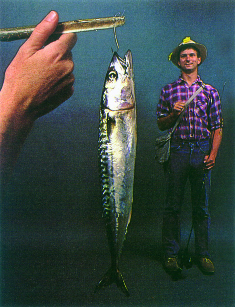 环境尺寸幻觉:遮住人,鱼看起来是正常尺寸;遮住手,鱼就显得非常大了。