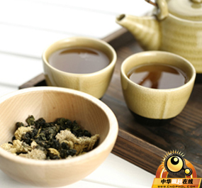 做法: 菊花乌龙茶叶各适量同放杯中, 用滚水冲泡, 加盖焗片刻即可饮用