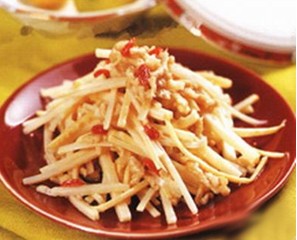 3.枸杞肉丝配料:枸杞100克猪瘦肉300克青笋(或玉兰片)10克猪油100克另炒菜佐料适量制作:将猪瘦肉洗净,切成6厘米左右的细丝,青笋同样制作,枸杞子洗净。待油七成热时,下人肉丝、笋丝煸炒,加入料酒、酱油、食盐、味精,放入枸杞,翻炒几下,淋人麻油即可。说明:枸杞可滋补肝肾,润肺明目。猪肉富含蛋白质,通过补益身体,使气血旺盛,以营养眼内各组织。