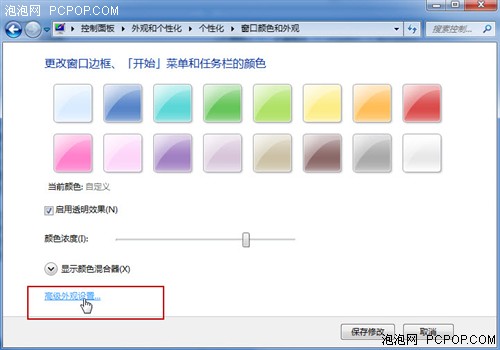首先,我们在Win7桌面空白处点击鼠标右键,选择进入“个性化”设置窗口,这一点与设置Win7主题壁纸相同,相信对大多数Win7电脑用户来说都是轻车熟路。在个性化设置窗口下方我们点击“窗口颜色”,没错我们就是要更改整个Win7桌面的视觉相关参数以达到对眼睛更柔和目的。选择“高级外观设置”进入: