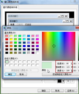 下面我们就开始设置窗口颜色和外观,选择“窗口”将对应的颜色设置点击打开选择“其他”。在自定义颜色窗口中,请按照以下参数来进行设置,将色调改为:85,饱和度:123,亮度:205,添加到自定义颜色,然后选定使用该颜色。