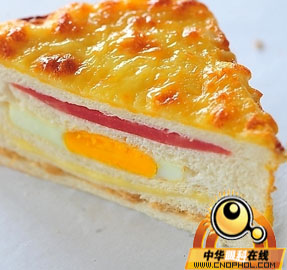 原料:面包片、鸡蛋、熟火腿、奶酪、西红柿、沙拉酱各适量
