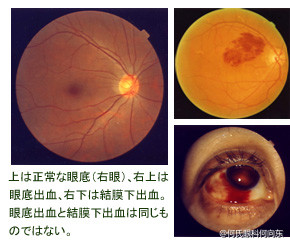 左图:正常眼底。右上:眼底出血。右下:结膜下出血。