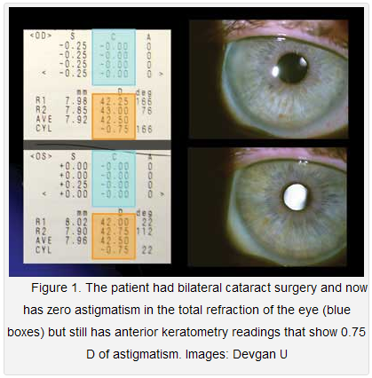 最近有一位患者术后效果幸运的接近完美:右眼为-0.25D球镜,左眼完全正视。这使得他双眼的裸眼视力均为20/20,达到了非常高的满意度。但奇怪的是,虽然他整个眼球总的屈光度没有散光,但角膜曲率计度数显示了0.75WRT顺规散光(Figure 1)。这是因为我们测量的特性所致:角膜曲率计仅能测量角膜前表面散光,而不能测量整个角膜的散光。在这个病例里,角膜前表面散光刚好被角膜后表面散光抵消,最终导致的结果是,该眼术后没有散光。