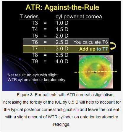 在做toric IOL计算时,如果用标准角膜曲率计测量的角膜散光为2.5D顺规散光,我们应该清楚需要治疗的散光要比测得的度数少0.5D,因此,我们从计算的T6 IOL(2.5 D of toricity)降低到T5 IOL(2D of toricity)。我们应该记住,对于顺规散光,应降低一个级阶(Figure 2)。
