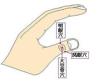 在我们的姆指上有三个相邻接的穴道分别是明眼、凤眼、大空骨(如上图),明眼、凤眼能够改善眼睛疲劳和急性结膜炎,大空骨则可改善一切有关于眼睛的症状。
