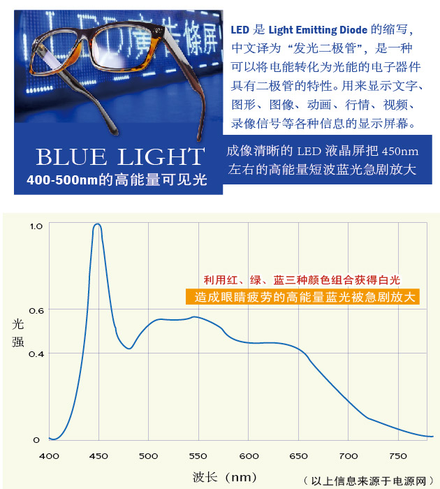 (一)蓝光是什么?高能量短波蓝光不断加速视网膜黄斑区的细胞氧化,引起“疲劳、怕光”等不适症状。长年累月的蓝光刺激还会积累性损伤视觉细胞,给视网膜造成不可逆的伤害,诱发黄斑变性等眼底疾病。