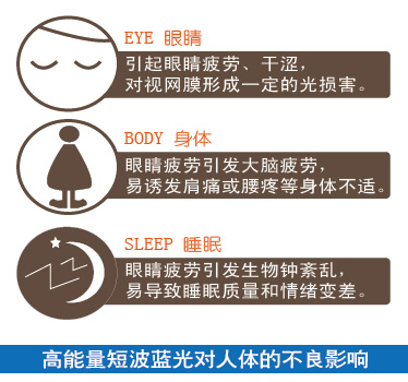 最近“难以入睡”、“睡眠浅”等存在睡眠苦恼的人数不断增加,这有可能是睡眠的质量下降造成的轻度失眠。睡眠的质量下降,会使白天工作的工作效率下降,对精神紧张等状态面起到很大的影响,还会容易肥胖,甚至影响到寿命的长短。失眠的原因是由于不规律的饮食和生活方式、加上电脑和智能手机等长时间使用造成眼睛的疲劳、紧张、疲惫。特别是被液晶显示屏散发出的蓝光长时间照射后,不但是疲劳,还会引起体内的生物钟混乱,给睡眠和健康带来重大的影响。