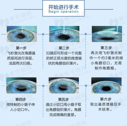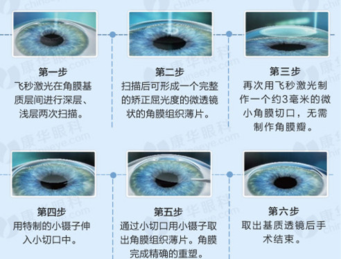 此外,还有德国蔡司的全飞秒,用飞秒激光在角膜基质上切两层,制作一个角膜基质透镜,然后切一个4毫米左右的切口,将角膜透镜取出。避免了制作角膜瓣,切口小,角膜周围的神经不用全部切断。