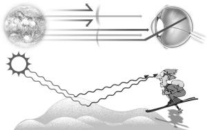 皑皑白雪,无疑是冬天最鲜明的标志。漫天漫地,银装素裹,当真美丽。然而,雪对光的吸收能力却大大降低,被大量反射回来,使人感到十分眩目,这种问题在阳光充足的雪山上更加明显。这时,雪地对紫外线的反射量可增强5%-6%。大量紫外线被眼睛角膜与结膜吸收,会使眼睛产生类似电光性眼炎的损害。在阳光灿烂的日子里,将双眼直接曝晒在这种环境中时间过长,即可造成雪盲症。