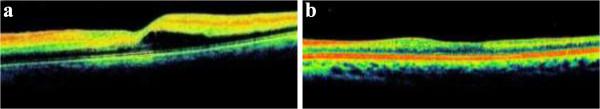 (1) 黄斑OCT:光感受器层光带明显增宽,反射性减弱,神经上皮层反射性增强,各层组织结构不能分辨。