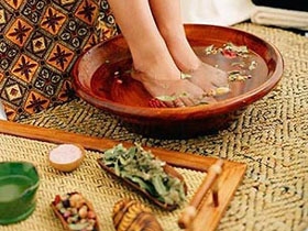 将上述八种药材,放入磁药罐中,加入一盆水煮沸,二十分钟之后,滤出药水,待药水晾至不烫伤肌肤的热度时浴足,足浴时,用食指关节按压双脚脚掌心面的第二趾和第三趾趾根部,力度略重一些更好。