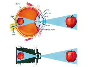 眼睛可以被看作是一台高级的照相机,我们的角膜和晶状体相当于照相机的镜头,视网膜相当于胶卷,从“镜头”到“胶卷”的距离称为眼轴,即眼睛的长度。 角膜相当于镜头最外层的玻璃,必须保持透明。当看近时,图像会落在“胶卷”后,此时晶状体就像伸缩镜头,通过调整自身的厚度,将“胶卷”后的图像前拉到胶卷上,这个过程称为调节。调节力会随着年龄增大而下降。