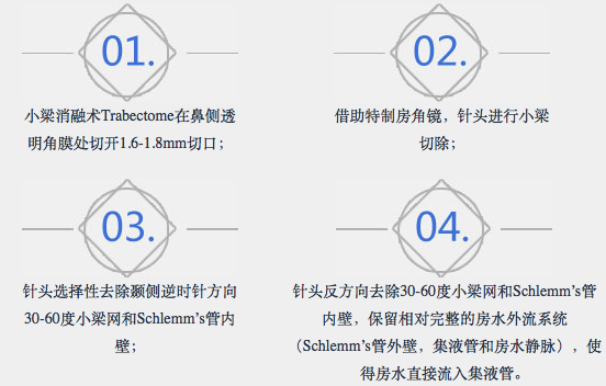 小梁消融术是一种新的抗青光眼手术方法,其原理是切开房水外流阻力最大的小梁组织,直接暴露小梁组织外面的schlemm氏管,使房水直接流入schlemm氏管,降低房水外流的阻力,达到降低眼压的目的。