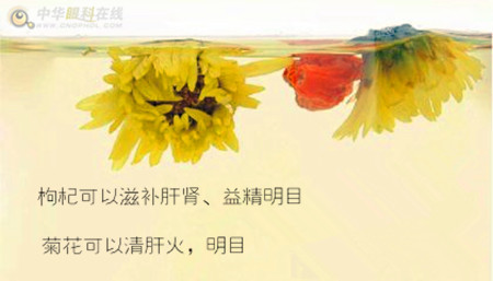 日常饮食建议:可用等量的枸杞、菊花泡水喝。枸杞可以滋补肝肾、益精明目,肝阴充足,才可以制约肝阳,使之不上旺化火,菊花可以清肝火,明目。