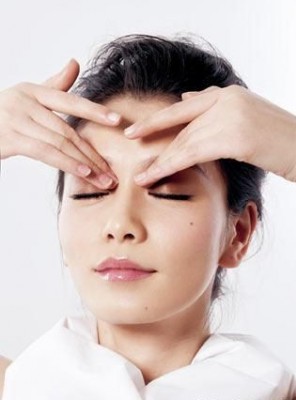 推眼睑。在眼睛周围涂抹按摩霜,用中指和无名指(中指放在上眼睑,无名指放在下眼睑)轻轻地由眼内眦向眼外眦推,连续10次。
