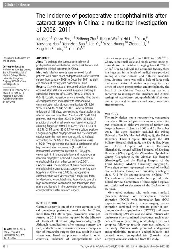 2013年之前,在我国白内障手术后感染的研究很少,没有全面反映我国白内障术后感染现状的多中心研究。中华医学会眼科学分会主委、浙大二院眼科中心姚克教授团队为此付出了大量的努力:2013年,姚克教授团队联合全国八家大型眼科,对2006-2011年共201757例白内障病例进行大规模调查,在《英国眼科学杂志》(British Journal of Ophthalmology)报道我国大型眼科白内障术后急性感染性眼内炎发病率为0.033%,并提出了预防和治疗的建议。