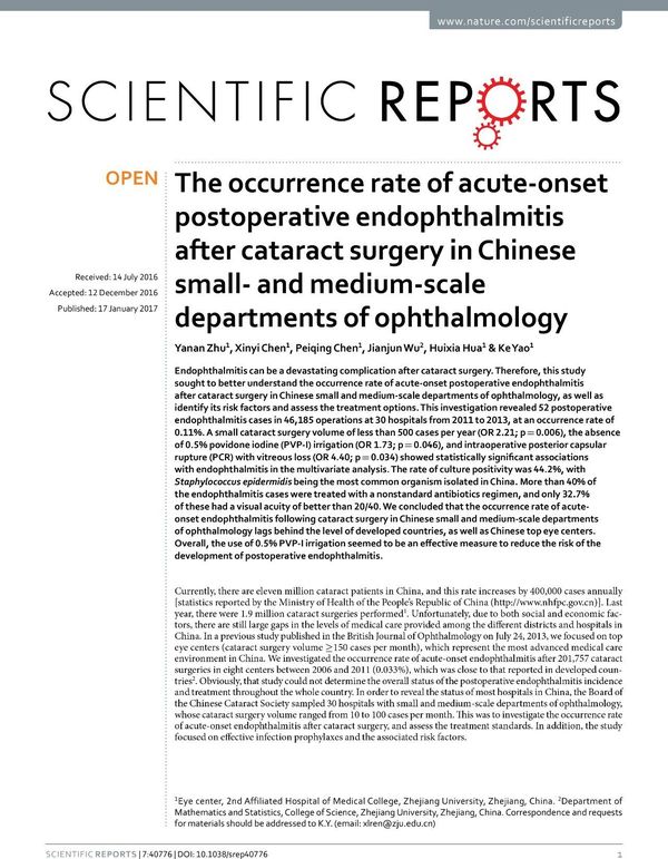近日,在《科学报告》(Scientific Reports)杂志上刊登了浙江大学附属二院眼科中心姚克教授研究团队“我国中小型眼科白内障术后急性感染性眼内炎的调查报告”。该调查收集了全国30家中小型眼科2011-2013年白内障手术病例共46185例,报道感染发病率为0.11%,为我国大型眼科发病率的三倍。