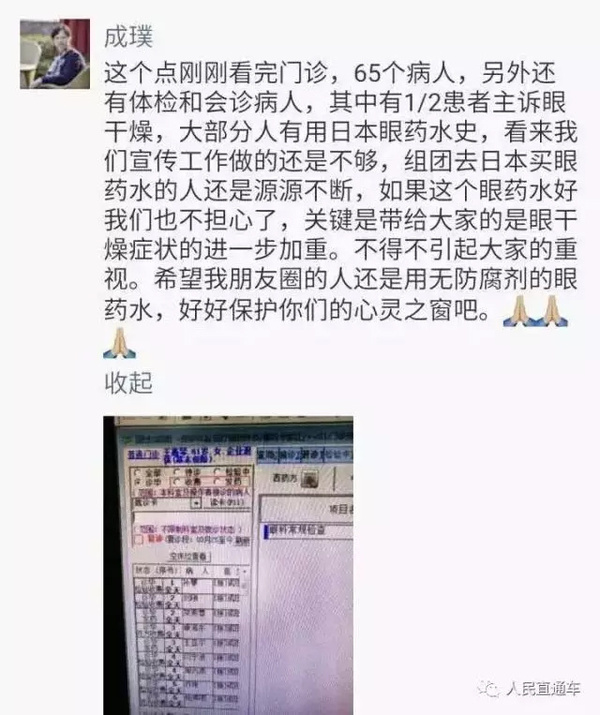 她是一个职场新手,工作时长期和电脑打交道,平时又爱玩手机,最近3个月来她总是觉得眼睛干涩伴发痒。“看到朋友圈里一款日本某品牌眼药水十分风靡,有减少血管充血、润滑眼睛、缓解眼睛疲劳的功效。我通过日本朋友代购给我来用。最初真的是效果显著,第一次用,清亮的感觉一下子激活了双眼。”