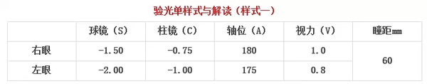 在上表中,右眼近视150度,合并近视散光75度,散光轴位是180度,戴眼镜后的矫正视力是1.0;左眼近视200度,合并近视散光100度,散光轴位是175度,戴眼镜后的矫正视力是0.8。