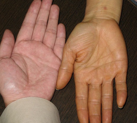 右边那只手出现了胡萝卜素血症的症状/dr-skin.com.tw