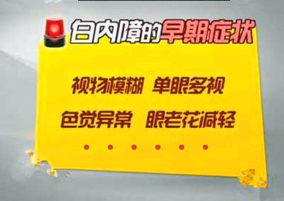 白内障的初期症状表现:视物模糊,视物逐渐模糊,有时会觉得光线周围出现光圈以及物体的颜色不够明亮。若是在夜间开车的话,会觉得对面过来的汽车车头灯太刺眼而感不适或烦躁。但一般而言,症状发展的过程相当缓慢,并视晶状体最混浊的位置及其发展过程而定。