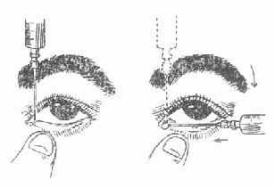 方法是用小棉签蘸0.5~1%的卡因溶液放于内眦部,嘱被检者闭眼夹住,3~5分钟后取下,以麻醉泪小点,将盛有5~10ml生理盐水的注射器安上一泪道冲洗针头(用6号或26号针头磨钝,稍加弯曲即成),垂直插入下或上泪小点,约1.5~2mm深,随之慢慢把针头转为水平,沿泪小管缓慢伸入,碰到骨壁后稍向后退一点,固定针头徐徐注入生理盐水。泪道通畅时,注射进无阻力,液体全部流到鼻腔或咽部;部分泪道狭窄者,一部分液体流到鼻腔或咽部,另一部分自上泪点返流,而且阻力较大;泪道阻塞者,液体全部自上下泪小点返流。如返流液带有粘液或脓性分泌物,证明是慢性泪囊炎。(图2--9)
