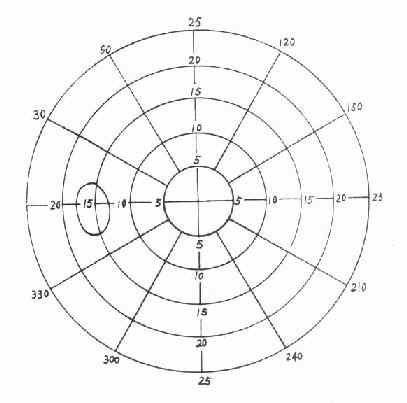 1.平面视野计法(campimetry):用来检查30°以内视野有无异常,主要检查有无病理性暗点。在自然光线下或人工照明下进行。受检者坐在用黑色呢绒制成的平面视野屏前1米处,将下颏固定于颏架上,被检眼注视平面视野计中心的白色固定目标点,另一眼用眼罩遮盖,用适宜的视标(常用直径为2mm),先查出生理盲点的位置和大小,然后在各子午线上由中心到周边,或由周边向中心缓慢移动视标,并在移动中均匀地与进行方向做垂直的轻微摆动,让受检者说出何处看到视标变形、变色或消失,用黑色大头针在视野屏上作出记号。发现暗点后,要围绕此处反复检查,标出其界限,最后把结果描记于平面视野表上。检查时,如查不出生理盲点,则表示检查方法不正确或病员对检查方法还不了解(图2—4)。