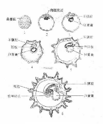 (一)胚板:受精卵经卵裂形成桑椹胚,再分裂成为囊状,名囊胚。囊胚的内细胞团分化成羊膜腔和卵黄囊。羊膜腔和卵黄囊相接近处,产生出内、中、外三胚层,形成胚板,即胚身的起源。(图1-38)