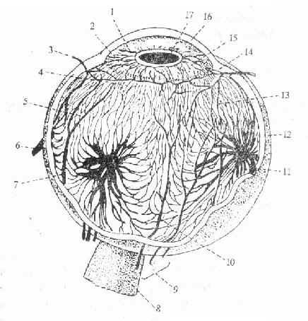 13.睫状前动脉回归支 14.睫状肌 15。虹膜 16.角膜 17.瞳孔