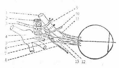 1.视神经;2.颈内动脉;3.动眼神经;4.三叉神经半月状神经节 ;5.长根;6.交感根;7.短根;8.下斜肌支;9.上支;10.鼻睫状神经;11.睫状长神经;12.睫状短神经;13.睫状神经节
