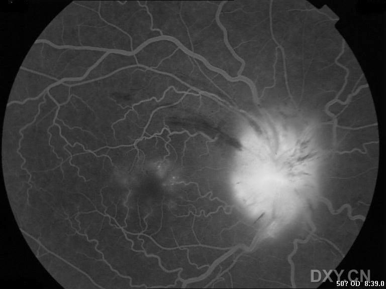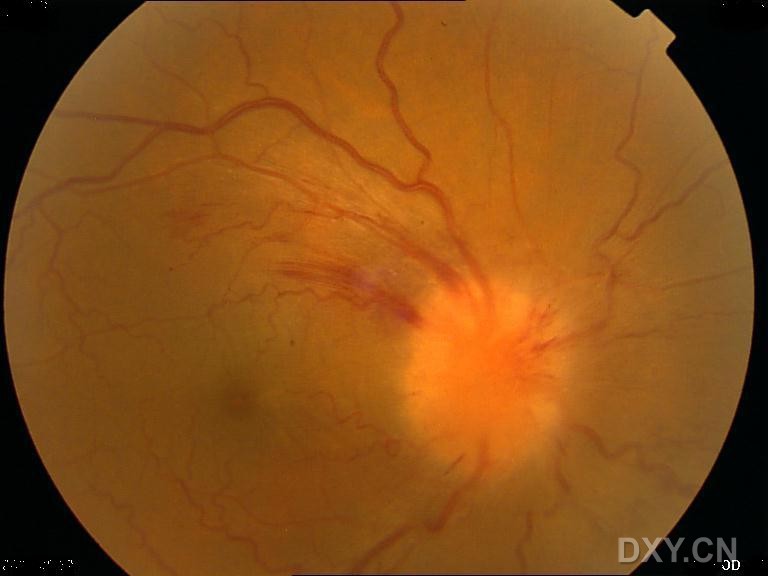 本例病人考虑为缺血性视乳头病变 1、视乳头主要由睫状后短动脉供血,凡是可以产生睫状动脉狭窄、闭塞或使视乳头灌注压降低的病变,均可造成视乳头缺血。其局部亲和因素是小视乳头,全身亲和因素是糖尿病、高血压、动脉硬化。(本例病人有高血压病史) 2、本病多发生于40-70岁,多为双眼,但一般不同时发病,两眼可间隔数周至数年。 3、视力突然减退,一般轻度或中度下降,发病前多有一过性视糊。RAPD(+) 4、眼底:视乳头色淡、界糊、水肿,多见视乳头及其附近网膜有线状或火焰状出血,网膜动脉较细,静脉轻度扩张。 最好能有病人的视野、FFA资料 视野多表现为与生理盲点相连的象限性缺损,常在下方。 治疗方案:降血压、扩张微循环,可同时全身应用糖皮质激素,以缓解微循环障碍所致水肿、渗出,大剂量使用,以保护第二眼免于发作(强的松片1.0-1.2mg/kg.qm)
