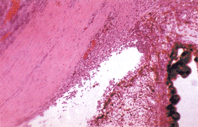 镜下见虹膜基质内有密集的多形核白细胞,是为急性炎症表现。前房内及小梁网内也积满多核白细胞,谓前房积脓。Schlemm管及深层集液管内充血。