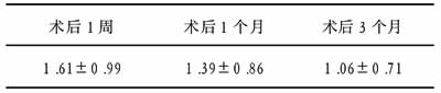 由此可以看出,随着术后时间的延长,手术性角膜散光度逐渐减小。术后1周与1个月比较,差异无显著性(P=0.312>0.05);术后1周与3个月比较,差异有显著性(P=0.000<0.05);术后1个月与3个月比较,差异有显著性(P=0.05)。