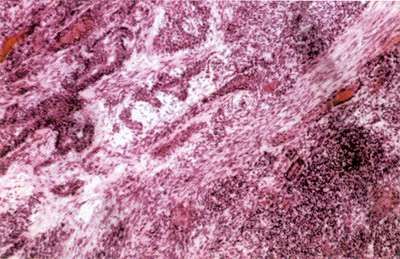 基底细胞癌是一种上皮细胞的恶性瘤,多来自皮肤表皮的基底细胞层。它可以发生在险皮内。 镜下见实质部分由上皮细胞组成。上皮实心或不规则的上皮突深入组织内生长;染色较深。其次是间质组织,即结缔组织与血管。它们与瘤细胞索条的排列顺序一致。血管均充血。间质中可见一侧有多量炎细胞浸润。