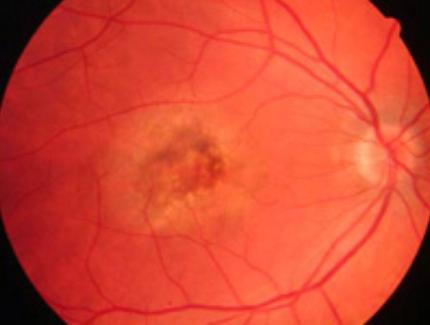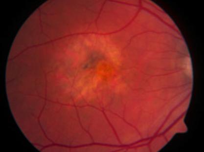 图4 就诊后1个月的眼底图。神经上皮脱离已经被色素变动所取代。