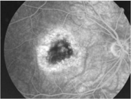 图5 1个月后的荧光血管造影,晚期染色但无渗漏。患者在随后几个月主诉视力有所提高。没有再接受光动力治疗。14个月后,患者右眼视力为20/20。右眼Amsler检查发现稳定的旁中心小暗点,持续存在了数月。神经上皮脱离处的视网膜色素变动也有进一步的变化,中心色素增殖周围有萎缩(图6)。荧光血管造影显示早期脉络膜大血管呈现高荧光(图7)。晚期色素萎缩处荧光素染色,中心色素增殖处遮挡荧光(图8)。