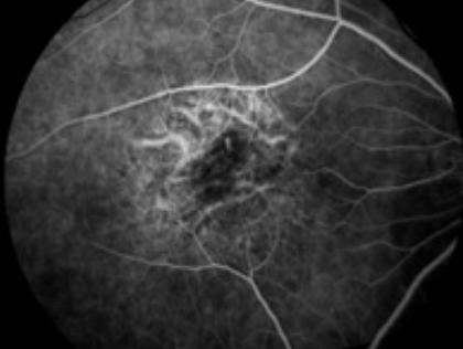 图7 就诊14个月后荧光血管造影显示色素萎缩区的脉络膜大血管。