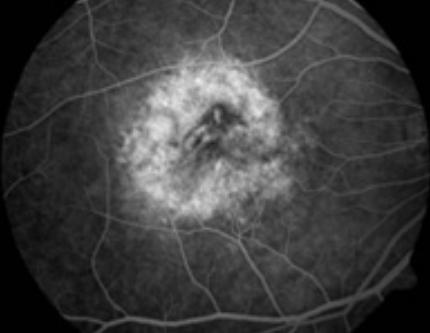 图8 就诊14个月后荧光血管造影显示中心色素增殖遮挡荧光,萎缩区荧光着染。