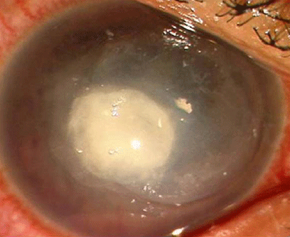 由此可以确定右眼的临床诊断是LASIK术后角膜炎。从溃疡边缘进行了角膜刮片。制作涂片并进行格兰氏染色,还进行了氢氧化钾封片。涂片的显微镜检查没有发现微生物。从角膜刮片中获得的样品还放入血琼脂、巧克力琼脂、Sabouraud琼脂、Lowenstein-Jensen培养基,以及Escherichia coli-覆盖了的无营养琼脂中进行了培养。 患者在住院期间使用了强化的每小时一次1.4%妥布霉素和5%cefazolin滴眼液,同时2%homatropine滴眼液每天4次的联合治疗。患者还接受了每天2次静脉注射200mg ciprofloxacin,需要时口服anglgesic。 角膜炎进一步进展表现为浸润增加伴有角膜溶解。药物治疗2天内,中央角膜溃疡区穿孔,虹膜组织嵌顿在伤口上。前房变浅,IOL很低。 培养结果显示有绿脓杆菌生长。此细菌对ciprofloxacin敏感,对氧氟沙星、妥布霉素、氯霉素、庆大霉素、cefazolin、万古霉素和四环素耐药。 对患者改用0.3%ciprofloxacin白天每小时一次,夜间每2小时一次,静脉继续使用ciprofloxacin。症状有改善,溃疡的大小和浸润的密度和大小减轻。第四天,形成了一个假性角膜,Siedel试验阴性。第10天,角膜溃疡完全愈合,Snellen视力表查小孔视力是6/60。随诊6周,右眼BCVA在-2.0DC×55°下为6/12,存在角膜瘢痕。