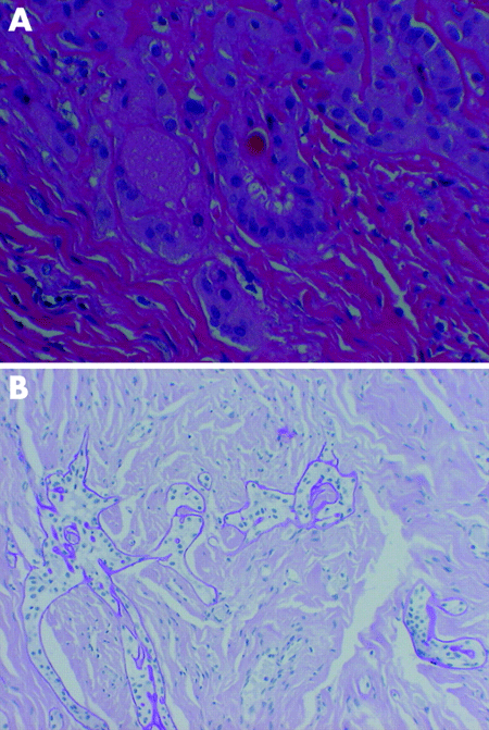 图1(A) 肿物镜下呈囊状结构,而且有厚的基底膜样物质和肿胀细胞(苏木精及伊红染色x20)。(B)基底膜包绕上皮细胞群(DPAS x10)。