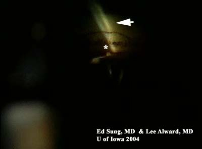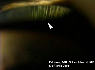 图1:前房角镜检查左眼Sampaolesi's线着色(箭头)