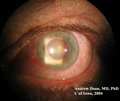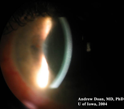 左眼裂隙灯:中度角膜水肿,前房轻度变深