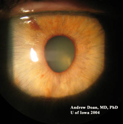 最佳矫正视力:双眼均为20/20mRx:右眼+1.75+2.00 x 179,左眼+0.75+1.50 x 174瞳孔:右眼正常,左眼见下图,无相对传入性缺陷。视野24-2:双眼完整眼外肌:正常眼压:右眼15mmHg,左眼17mmHg裂隙灯检查:右眼正常,左眼见下图DFE:双眼正常视神经:双眼0.4C/D(正常)