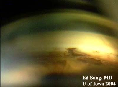 虹膜周边前粘连的大片区域在6点钟位置有萎缩区和虹膜间质色素沉着。