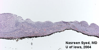 图6:虹膜黑色素瘤的病理图片低倍镜下被切除的含黑色素瘤的虹膜组织
