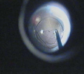 进行3点式平坦部玻璃体切割(PPV),松解了ECR-IOL复合体和玻璃体之间的粘连。玻璃体腔注入重水(PFCL),浮起ECR-IOL复合体,直到它接近瞳孔后方平面。用一个带10-0缝线的针(Prolene,model W 1713,Johnson & Johnson Ltd)在9点位角膜缘后20mm穿过巩膜,然后穿过IOL和ECR之间的纤维化囊袋(图2)。从一个角膜切口用一个30号针将缝线针引出。然后这只针从角膜切口重新进入前房,通过IOL襻-ECR的复合体,在一个30号针头的引导下再在角膜缘后2mm处的另一点巩膜将针穿出。用另外一根带10-0聚丙烯线的直针在3点位重复上述操作。然后在外面扎紧二处缝线。因为这时ECR-IOL复合体仍然存在扭距(图3),所以采用3点式的巩膜固定法,即用另外一根10-0聚丙烯(Prolene)线在上方12点钟用同样的方法固定ECR,以稳定这个复合体(图4)。随后,取出PFCL,用6-0 polyglactin(Vicryl,model W 9552,Johnson & Johnson Ltd)缝合巩膜切口。最后缝合结膜。