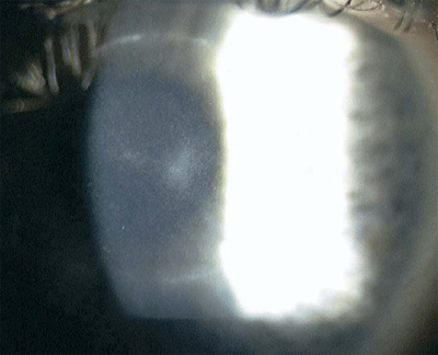 图2 患者4为右眼远视矫正PPK术后第8天。注意角膜中央2mm的浸润及其周围环状浸润。虽然培养结果为阴性,该患者仍按感染性角膜炎进行治疗,最终的裸眼视力为20/20。